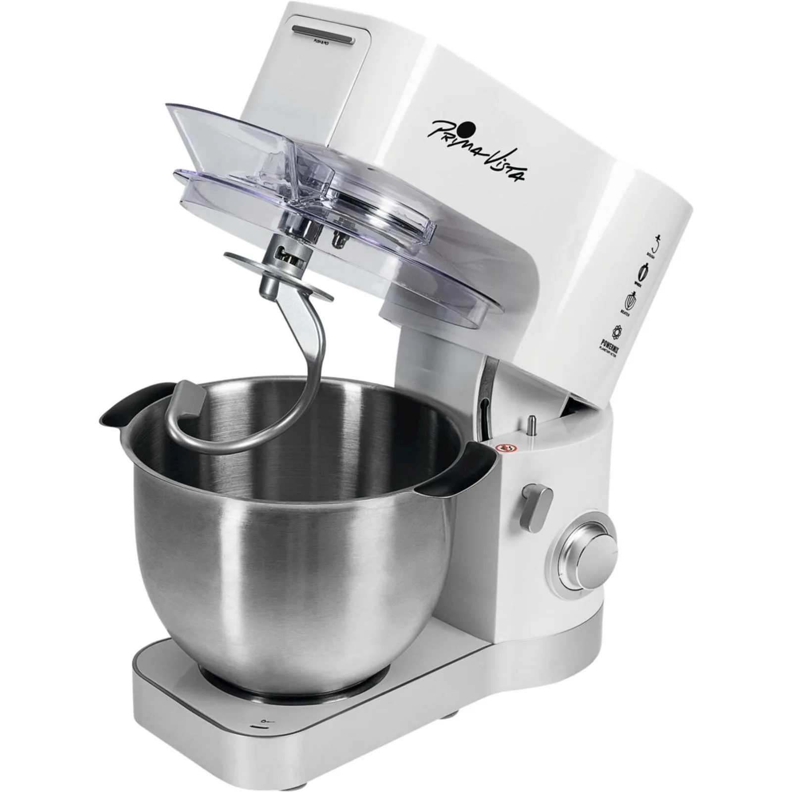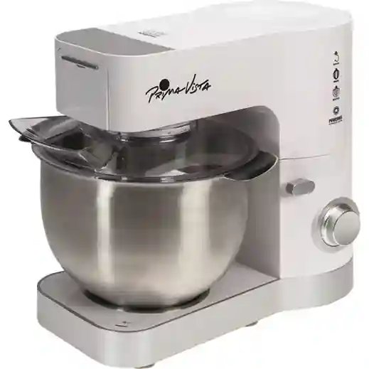 Prima Vista. Avec mouvement de mélange planétaire. Crochet mélangeur, fouet et crochet pétrisseur compris. Volume du bol : 5,5 l. Puissance : 1200 W. Dimensions : 38,6 × 27,8 × 35,1 cm.